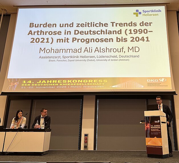 Osteoarthritis is increasingly becoming one of the most dominant widespread diseases in Germany. The chronic joint disease has a considerable impact on the quality of life of those affected. What is particularly alarming is that younger people are also increasingly affected - a trend that calls into question the previous perception of the disease as purely age-related. At the annual congress of the German Knee Society (DKG) in Wiesbaden - one of the most important scientific forums for modern knee surgery and research - Mohammad Alshrouf, Assistant Physician in the Department of Shoulder, Elbow and Knee Surgery and Traumatology at Sportklinik Hellersen, presented his current research findings.